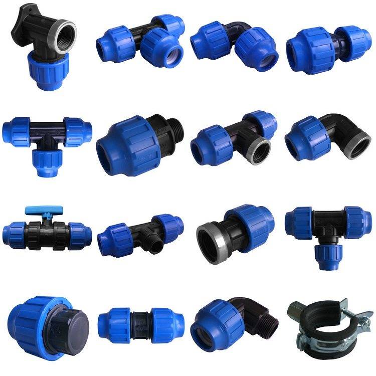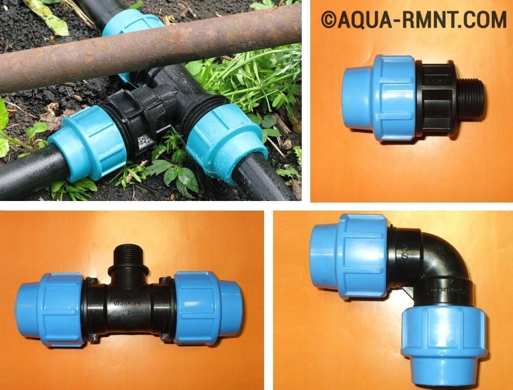 Полиэтилен низкого давления. Такие изделия привлекают тем, что конструируются без вспомогательных элементов. Фитинги для работ с такими материалами оснащены резьбой и легко закручиваются вручную.