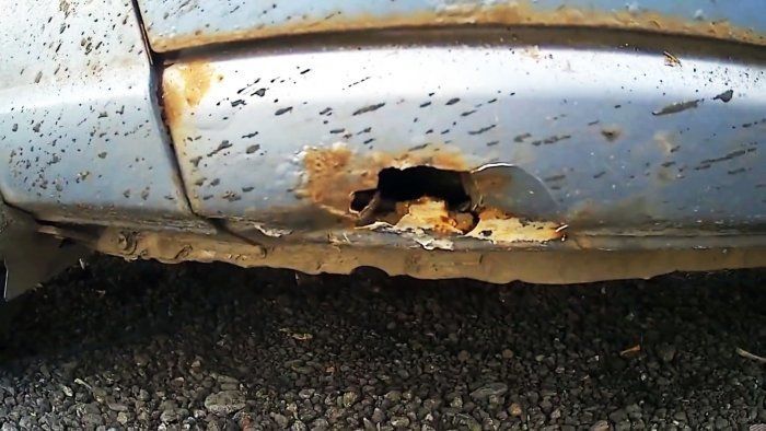 - Заклеить дыру стеклотканью с эпоксидной смолой — способ приемлемый, бюджет минимален, не требуется спец оборудования и навыков. Вся суть состоит в очистке дыры и металла вокруг нее от ржавчины и подклейка изнутри стеклоткани, а сверху все ровняется шпаклевкой.