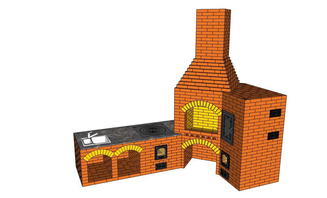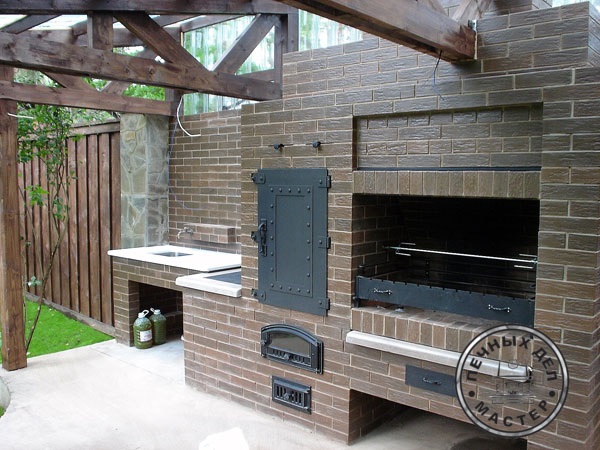 Разнообразить конструкцию можно дополнительными нишами для хранения дров, посуды, аксессуаров. При готовке очень удобно иметь под рукой мойку и рабочее место для разделки мяса.