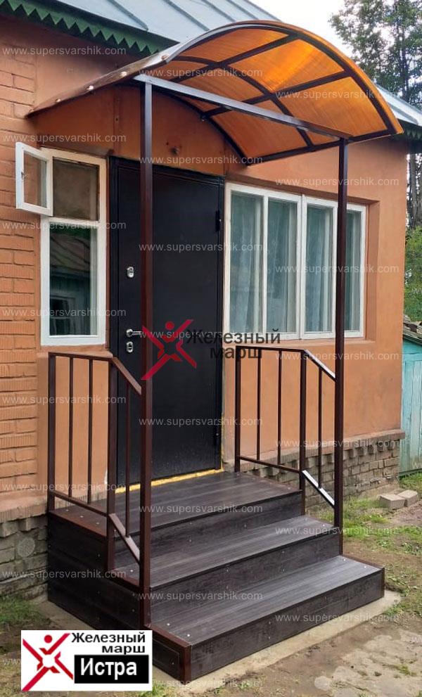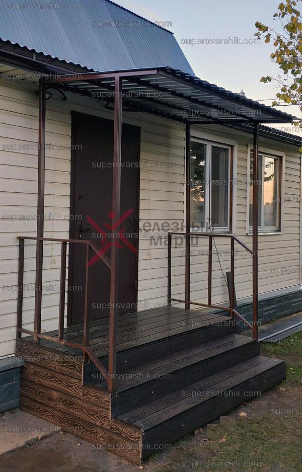 Ступеньки лучше всего расположить по кругу от главной площадки, таким образом получится небольшая конструкция, обеспечивающая вход с трех сторон. Чтобы защитить вход от солнца и дождя, можно дополнительно изготовить и установить металлический козырек. При этом декор козырька должен полностью повторяться в узорах перил.