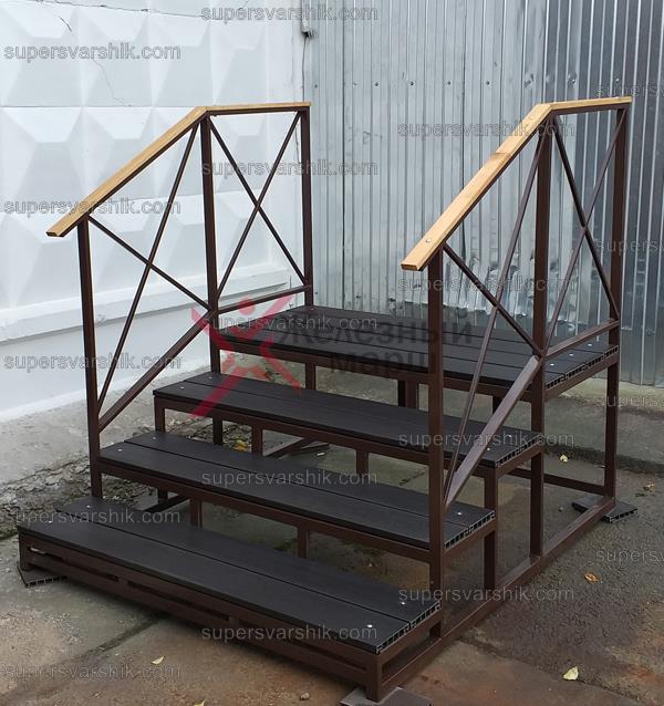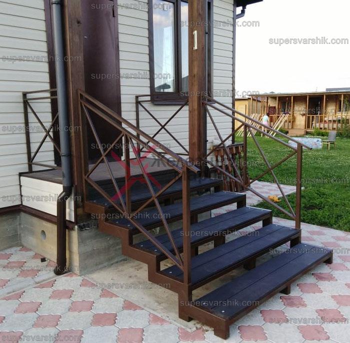 Более высокой степенью долговечности отличается установка металлической лестницы на крыльцо. Для того, чтобы конструкция не имела слишком большого веса, а также с целью экономии материала, для изготовления лестницы используется лишь одна тетива, находящаяся по центру. Сваренные ступени имеют форму рамы, а для изготовления проступей используется как дерево, так и металл.