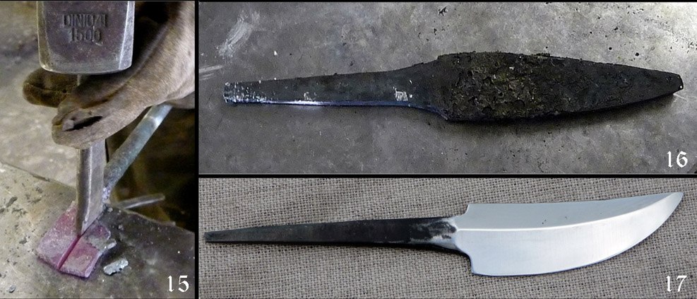 С помощью ковки создается форма ножа и меняется его ширина. Закалка стали улучшает качество материала, нагревание в масле придает ей черный цвет (воронение), что также дает дополнительную защиту от коррозии. К тому же, ножи из вороненой стали выглядят очень эффектно.