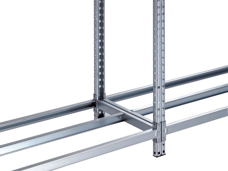 Усиленные полочные стеллажи имеют стоечно-балочную конструкцию — продольные балки, на которые устанавливаются полки-вкладыши, усиливают максимальную нагрузку на полку, обладают усиленными связями и дополнительными ребрами жесткости.