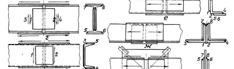 Рис. 3. Стыковые соединения профильного металла: а — двутавра с фасонкой, б — уголка с фасонкой, в — швеллеров