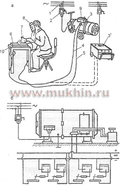 7.6.4. В зависимости от вида источника питания электроэнергией различают: автономные электросварочные установки, снабженные индивидуальными двигателями внутреннего сгорания (карбюраторными — бензиновыми или дизельными), и электросварочные установки, получающие питание от электрических сетей, в том числе присоединяемых к передвижным электростанциям.